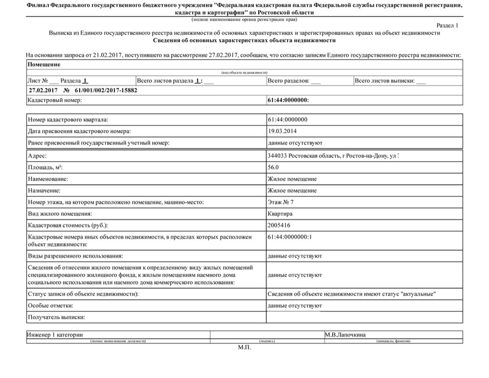 В этот раздел документа переносят данные об объекте из выписки ЕГРН: