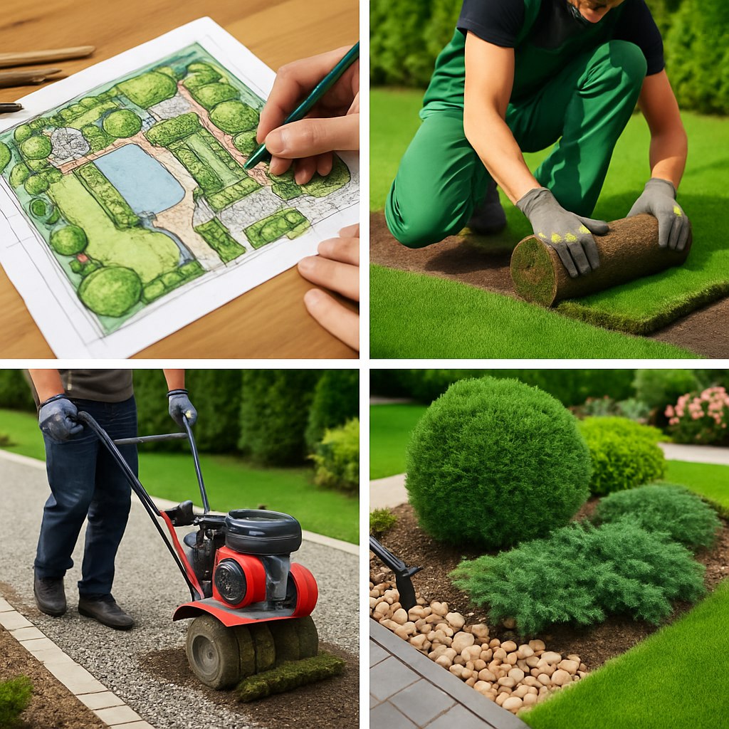 Включает земляные работы и вертикальную планировку, то есть изменение рельефа участка, прокладку инженерных систем, устройство дорожно-тропиночной сети и площадок. Также монтаж беседок, пергол, скамеек, декоративных элементов, устройство искусственных водоемов.