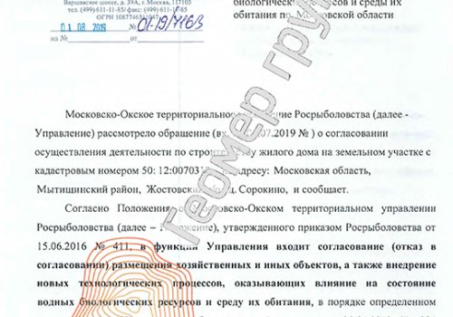 Согласование строительства с водоохранной зоной - агенство по рыболовству, с/о Жостовский, д. Сорокино